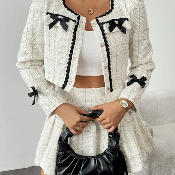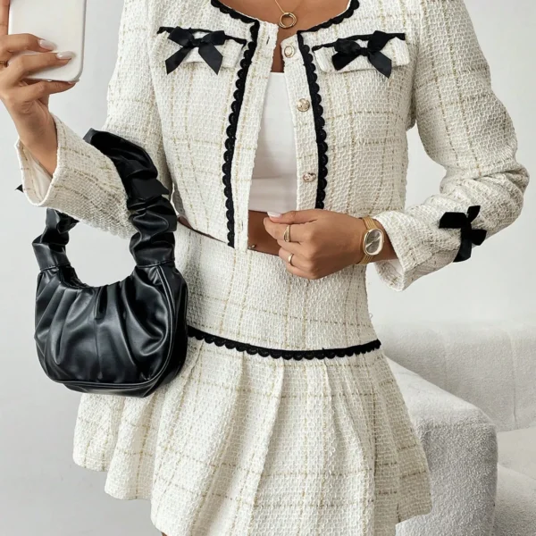 SMY 2pcs Women Elegant Set – Tweed Jacket With Bow Decor & A-Line Pleated Skirt