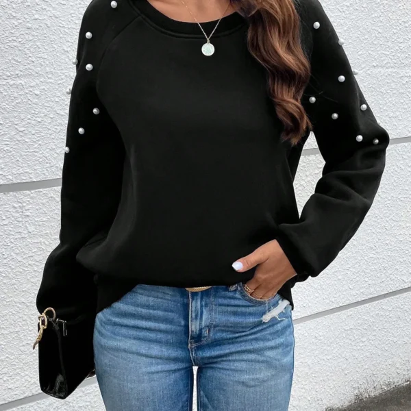 SMY 1pc Women Stylish Elegant Black Mesh Polka Dot Sleeve Rhinestone Decorated Sweatshirt