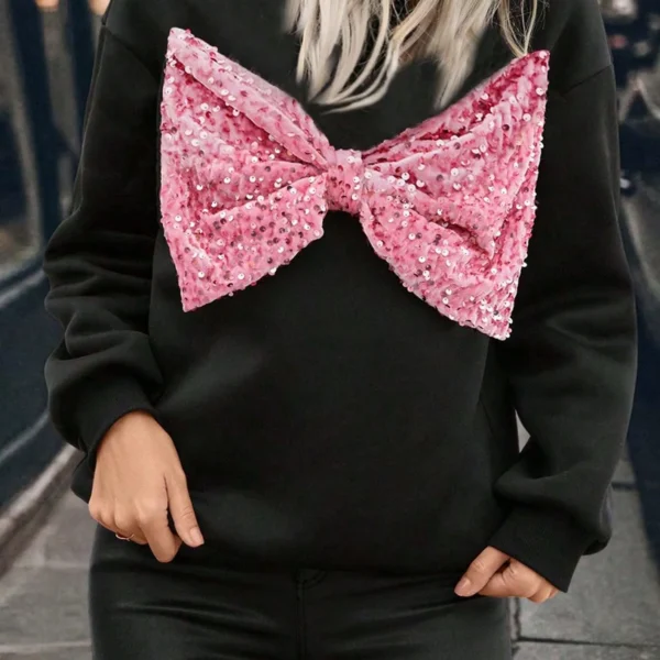 SMY Women’s Fashionable Casual Black Sweatshirt With Sequin Pink Bow