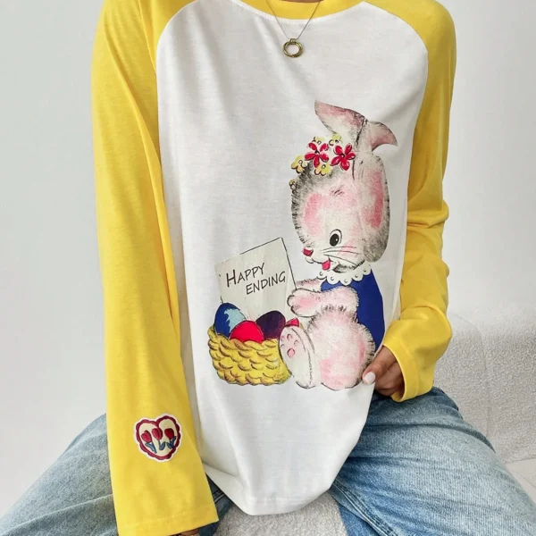 SMY Women’s Fashionable Cute Yellow Raglan Sleeve White Splice Rabbit Print T-Shirt