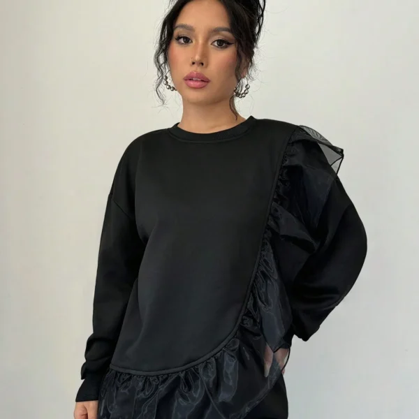 SMY Women’s Casual Stitching Mesh Ruffled Pullover Sweatshirt , Black Sweatshirt