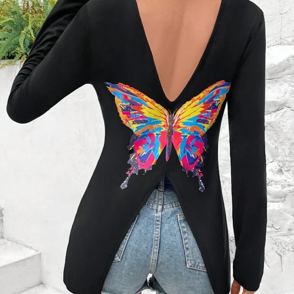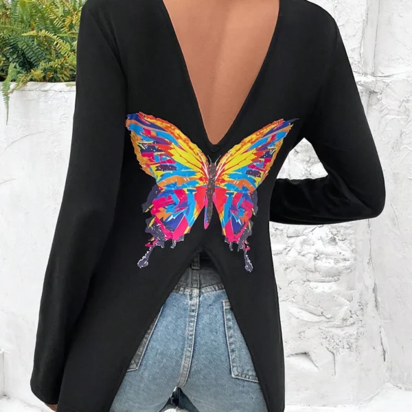 SMY Women’s Casual Long Sleeve V-Neck Hollow Back Placement Printed T-Shirt