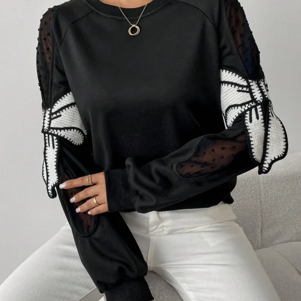 SMY 1pc Women Stylish Elegant Black Mesh Polka Dot Sleeve Rhinestone Decorated Sweatshirt