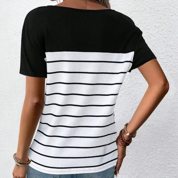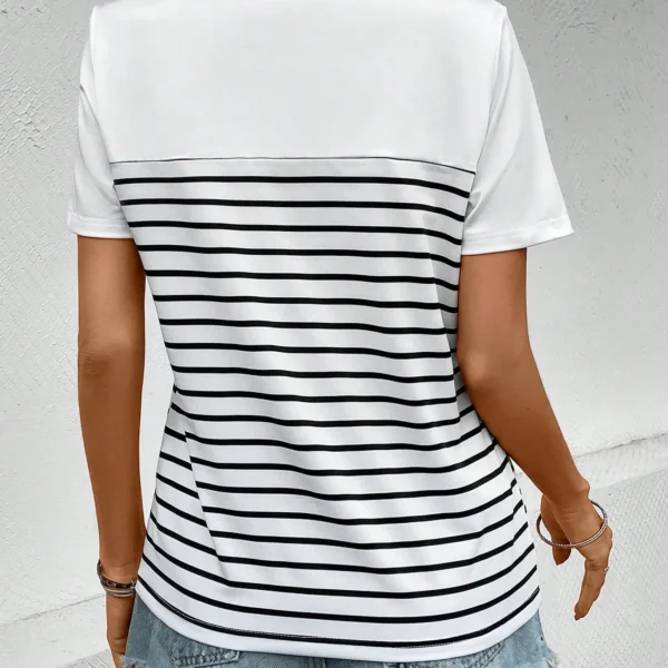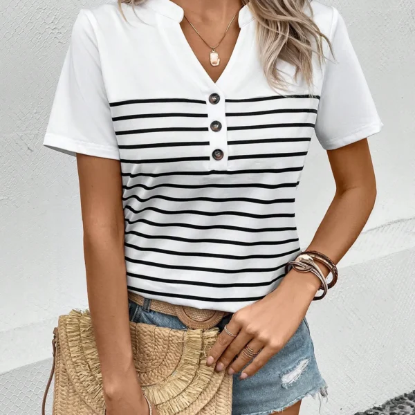 SMY Casual Stripe Print Trend Small V-Neck Short Sleeved T-Shirt