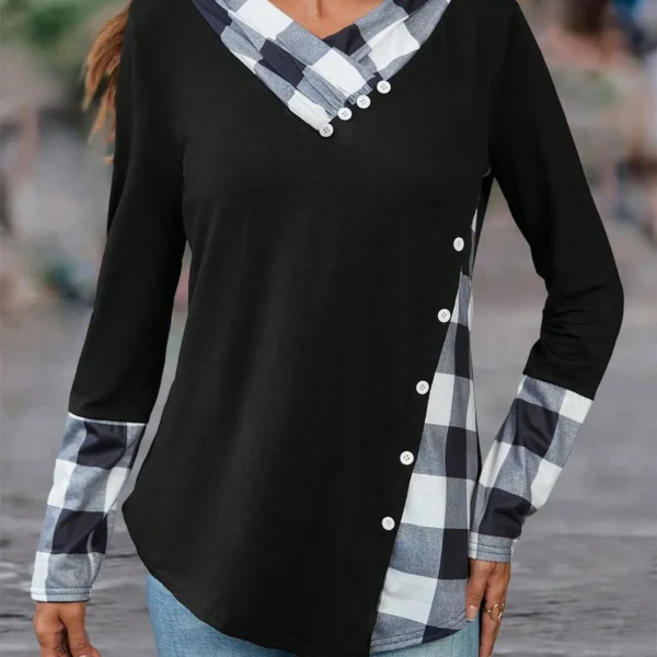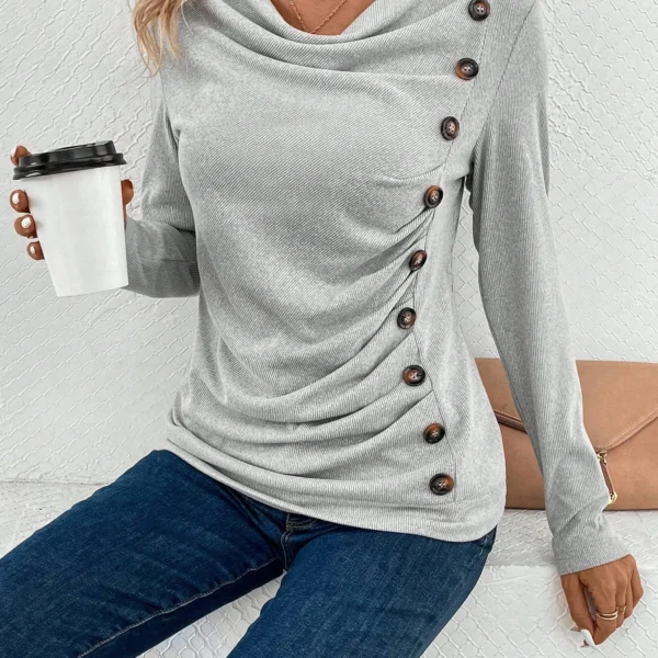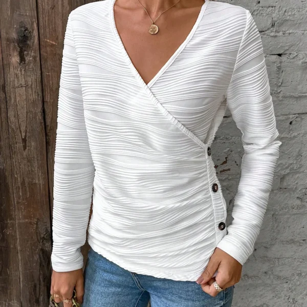 SMY Casual Trend Small V-Neck Women’s V-Neck Clean Color Spliced Pleated Button Casual T-Shirt