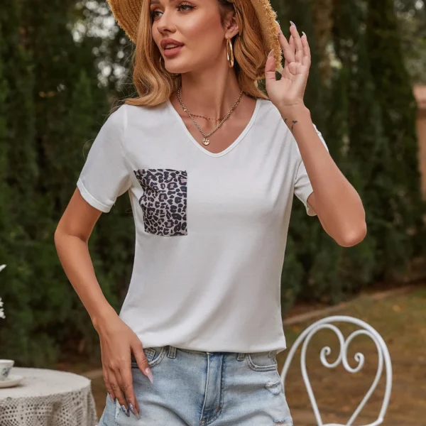 SMY Casual V-Neck Short Sleeved T-Shirt With Leopard Pocket