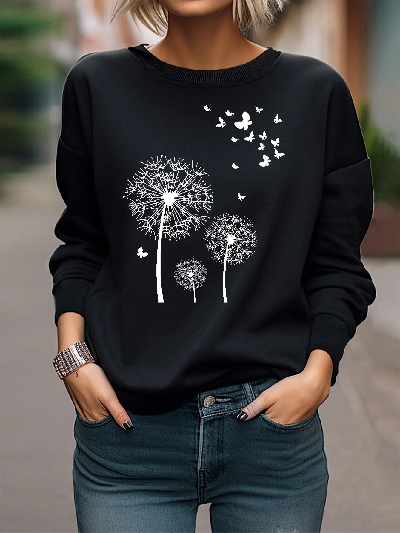 SMY Dandelion & Butterfly Print Drop Shoulder Sweatshirt