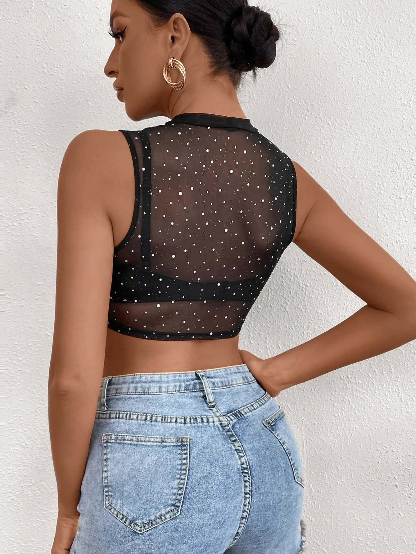 SMY Polka Dot Mock Neck Mesh Top Without Bra