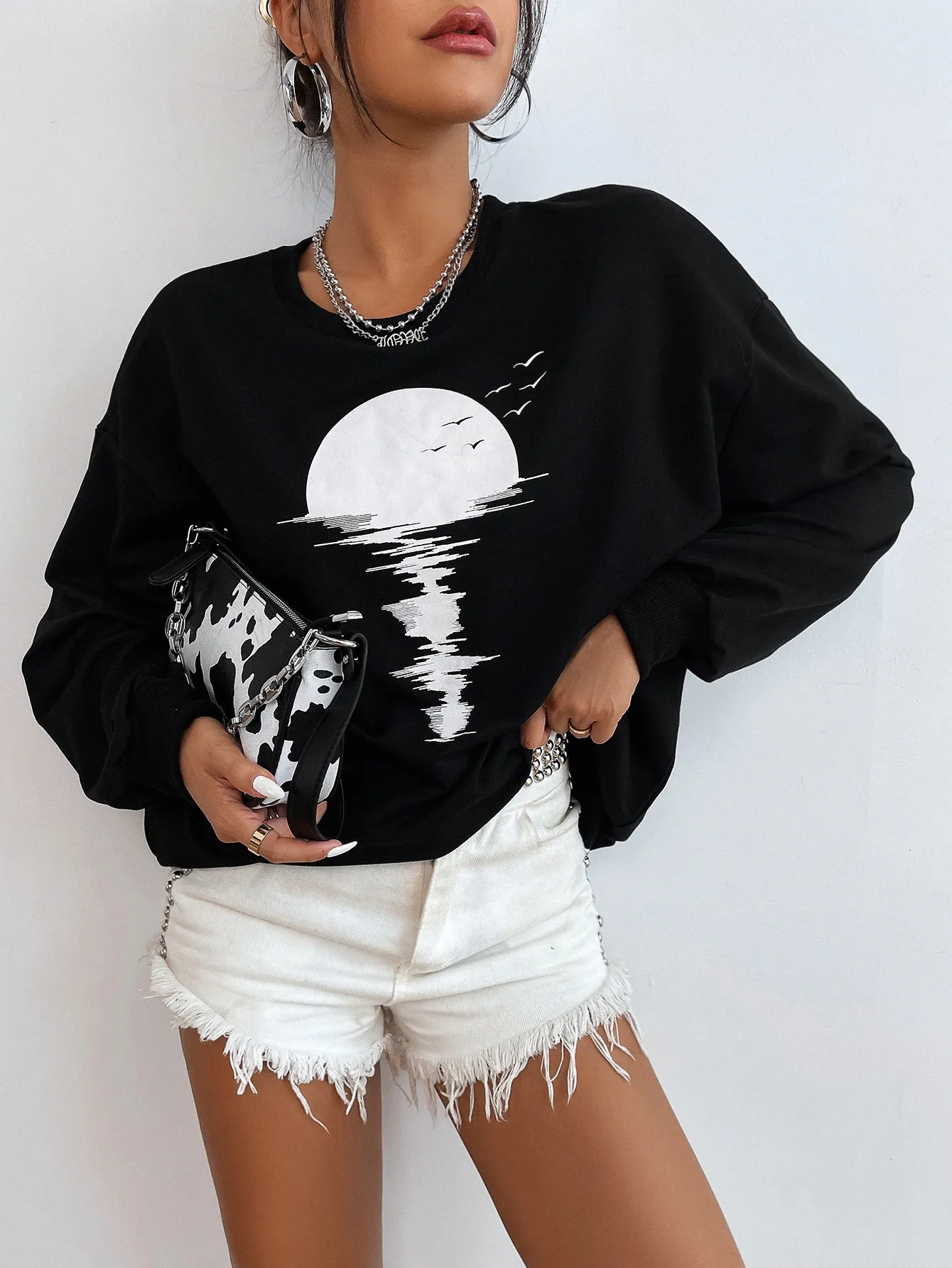 SMY Casual Moon Pattern Round Neck Long Hoodie