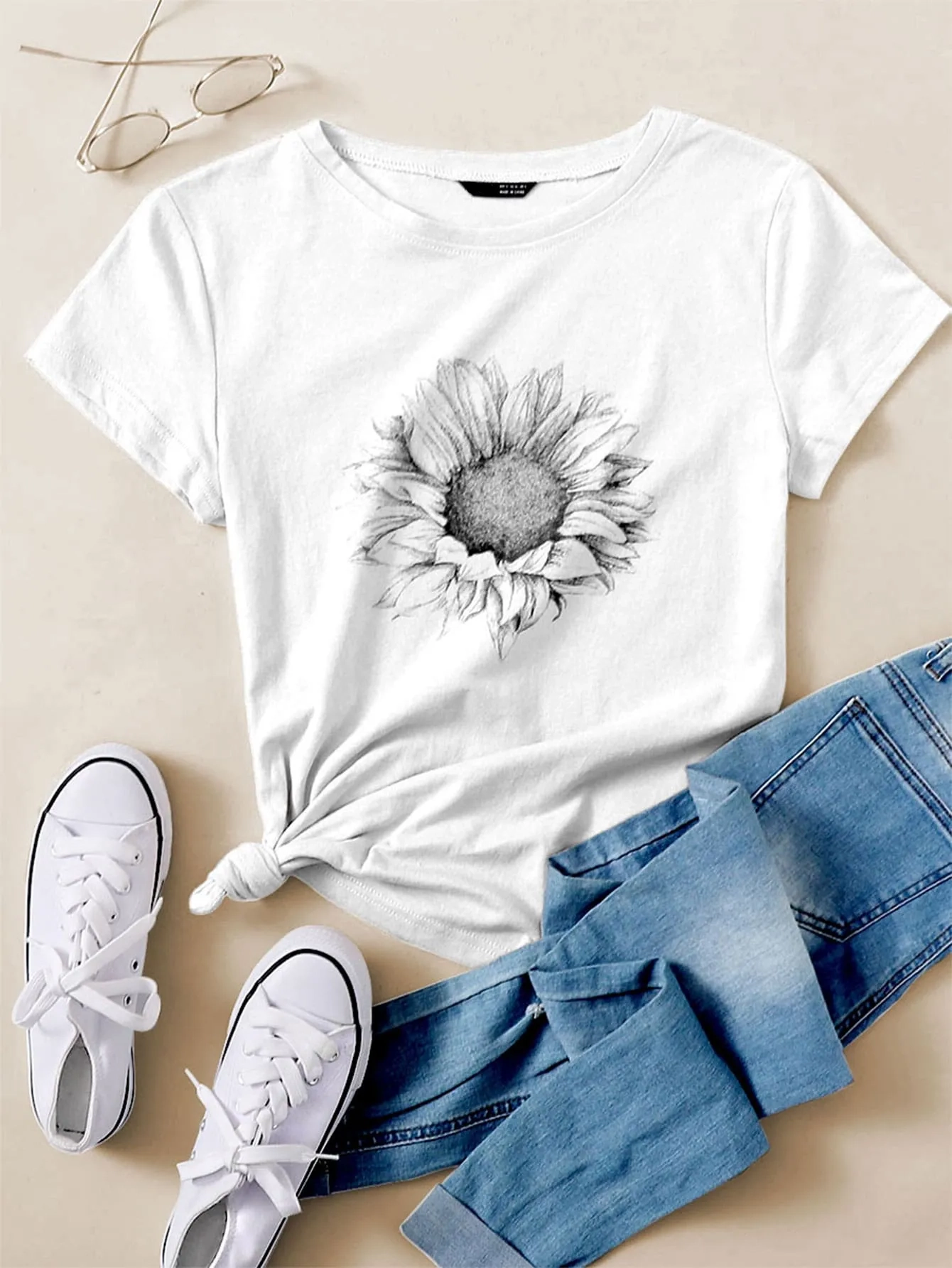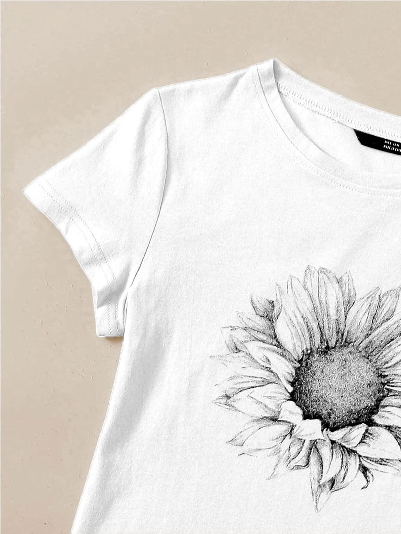 SMY Casual Sketch Sunflower Pattern Round Neck Simple Pattern Printed T-Shirt