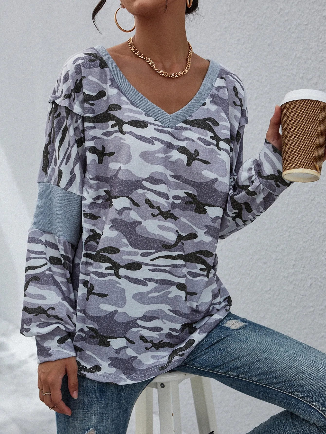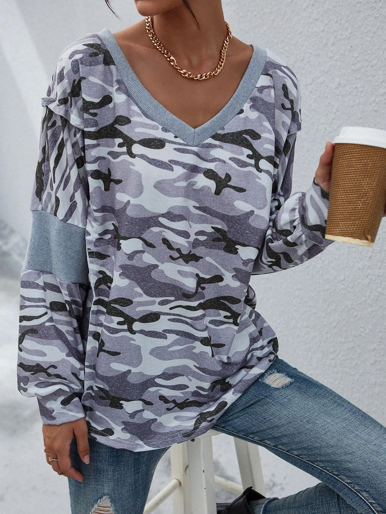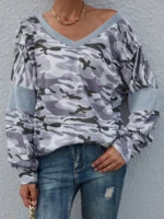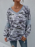 SMY Women’s V-neck Button Decoration Patchwork Long Sleeve Casual T-shirt