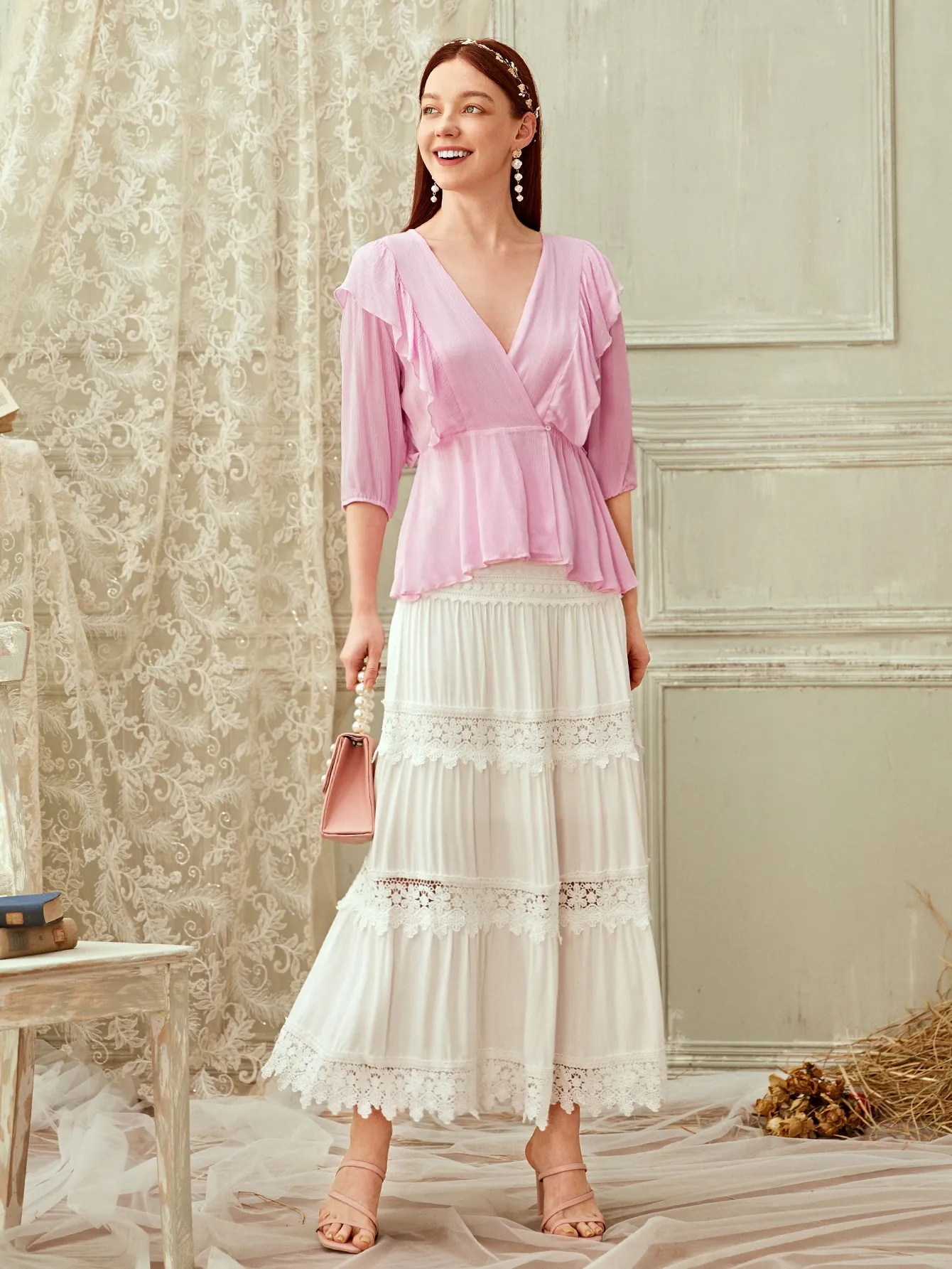 SMY Women’s Solid Color Contrast Lace Round Neck Short Sleeve Casual T-Shirt, Summer