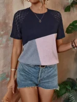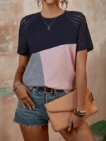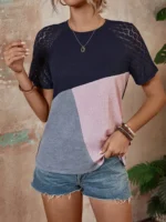 SMY Women’s Solid Color Contrast Lace Round Neck Short Sleeve Casual T-Shirt, Summer