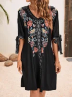 SMY Women’s Patchwork Plant Printed Short Flying Sleeve A-Line Dress