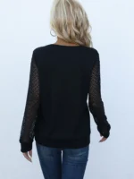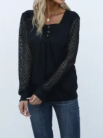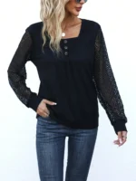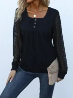SMY Women’s V-neck Button Decoration Patchwork Long Sleeve Casual T-shirt