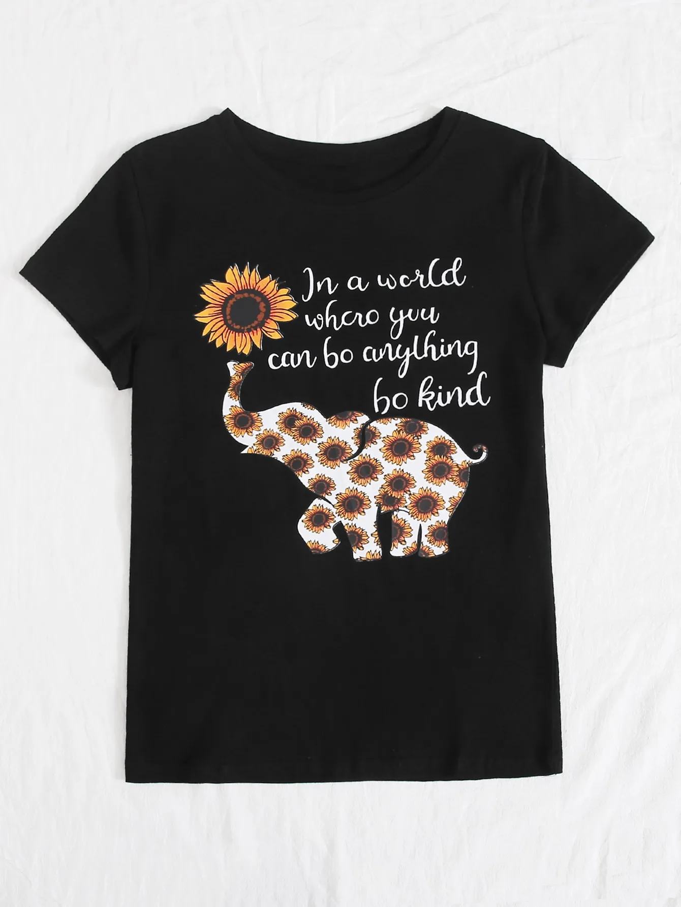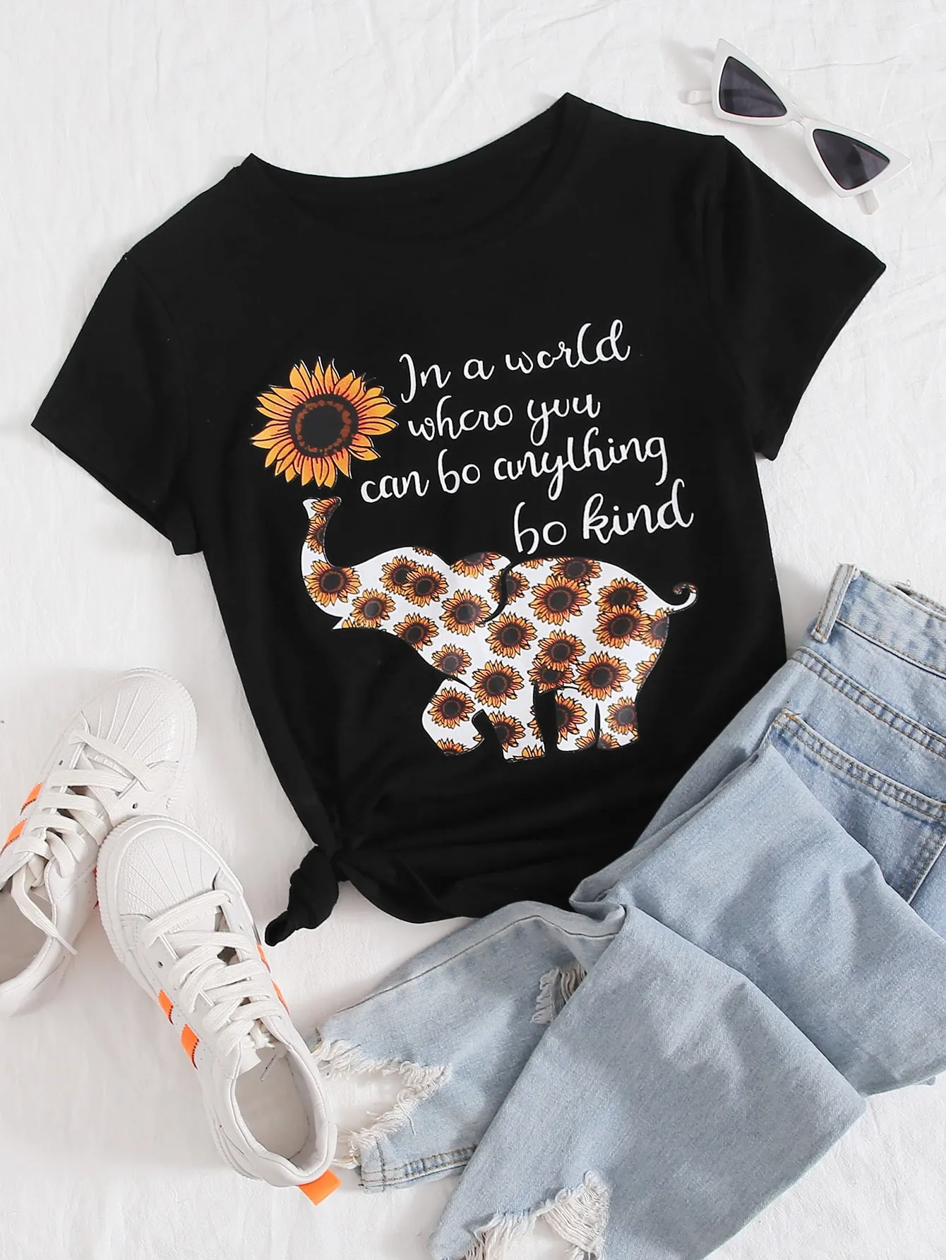 SMY Elephant And Sunflower Pattern Small Round Neck Simple Pattern Printed T-Shirt