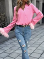 SMY Women’s Solid Color Crossover V-Neck Long Sleeve Pleated Casual T-Shirt