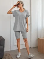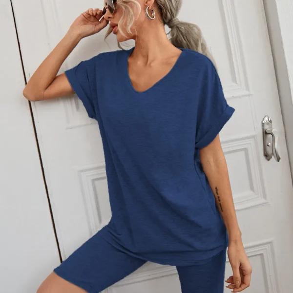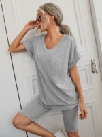 SMY 2pcs Women’s Solid Color Hollow V-Neck Short Sleeve Top And Shorts Summer Set