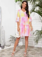 SMY Women’s Patchwork Plant Printed Short Flying Sleeve A-Line Dress