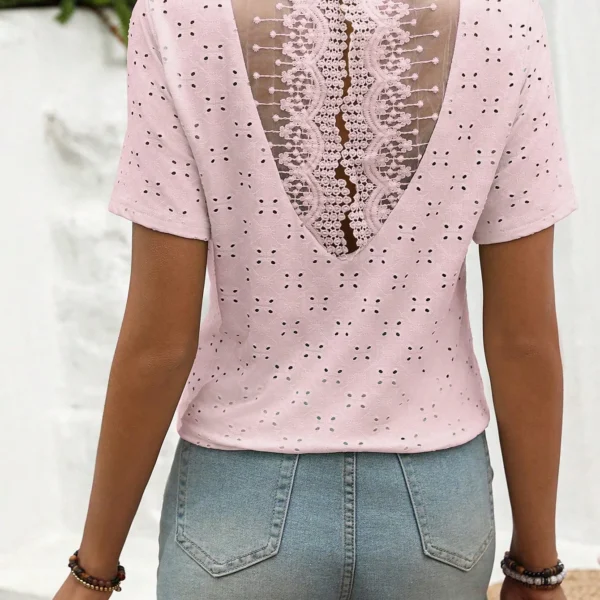 SMY Women’s Solid Color Contrast Lace Round Neck Short Sleeve Casual T-Shirt, Summer