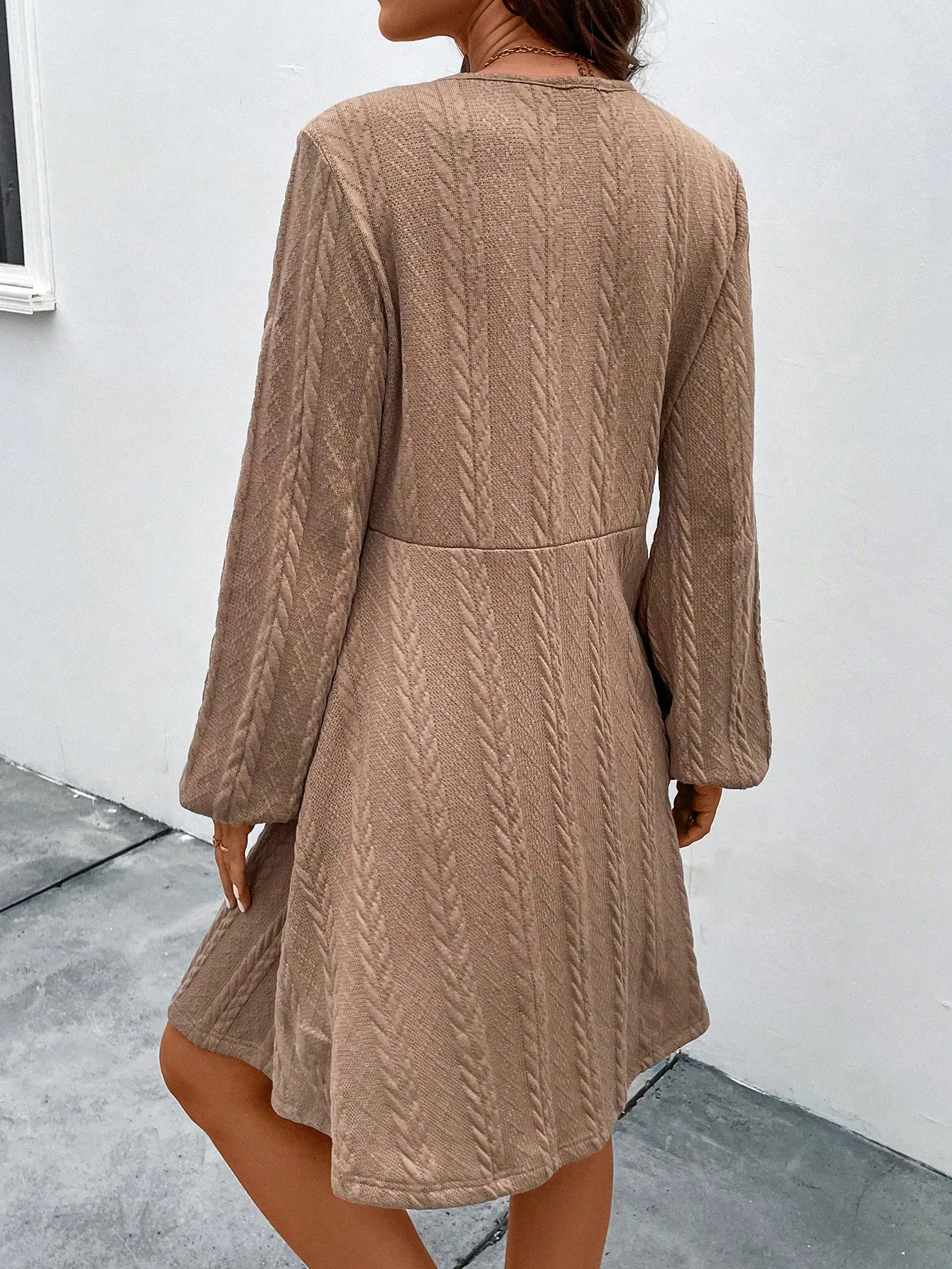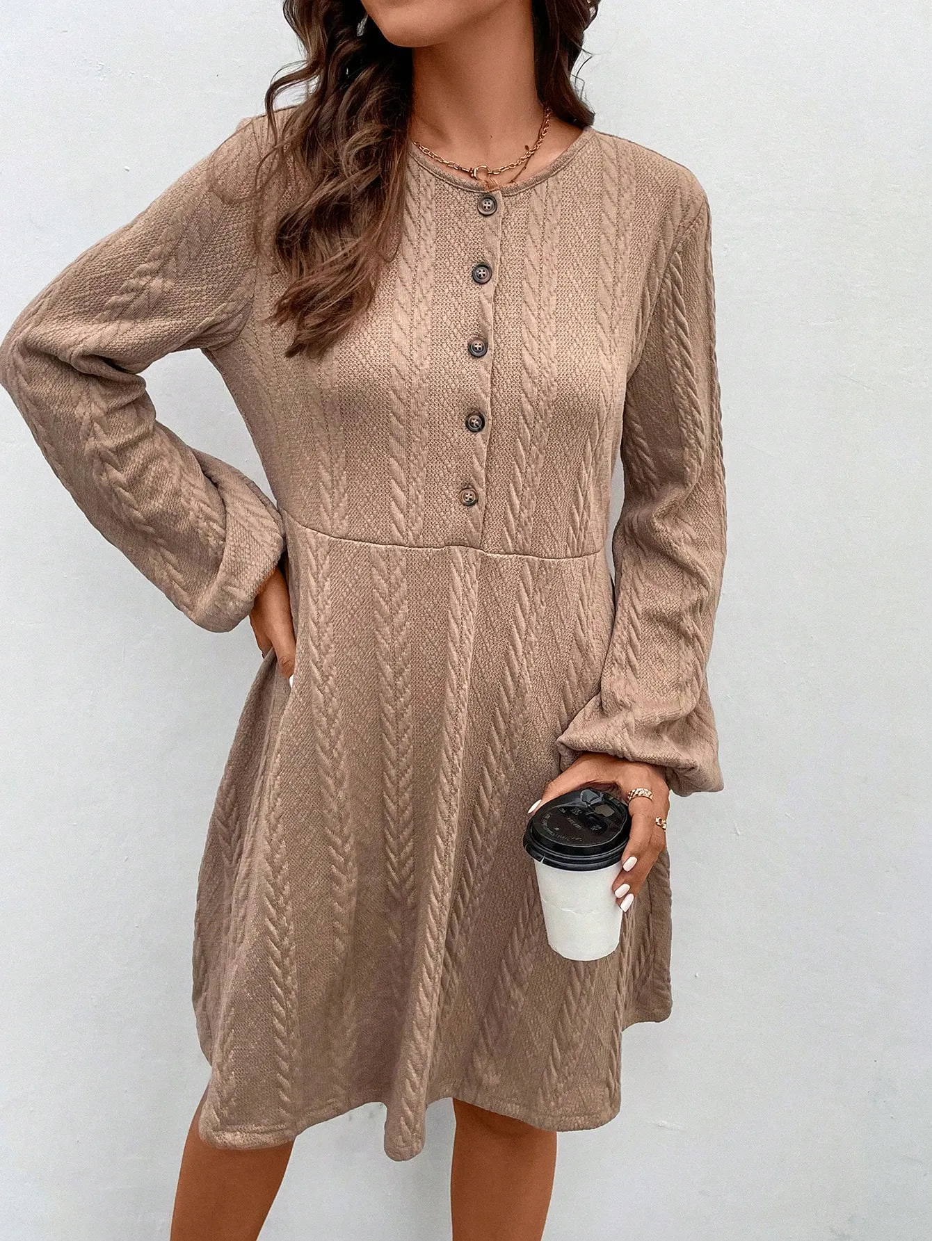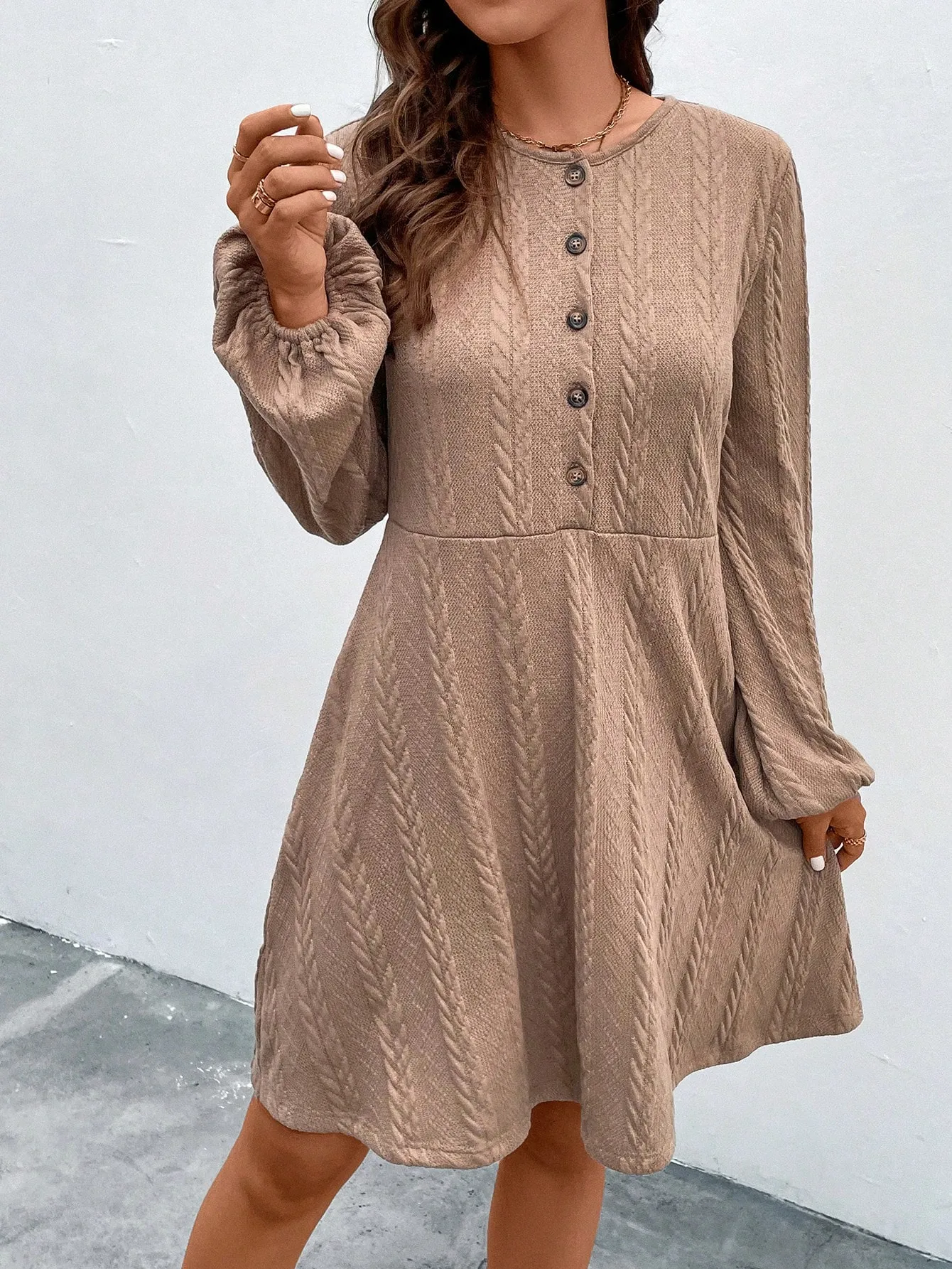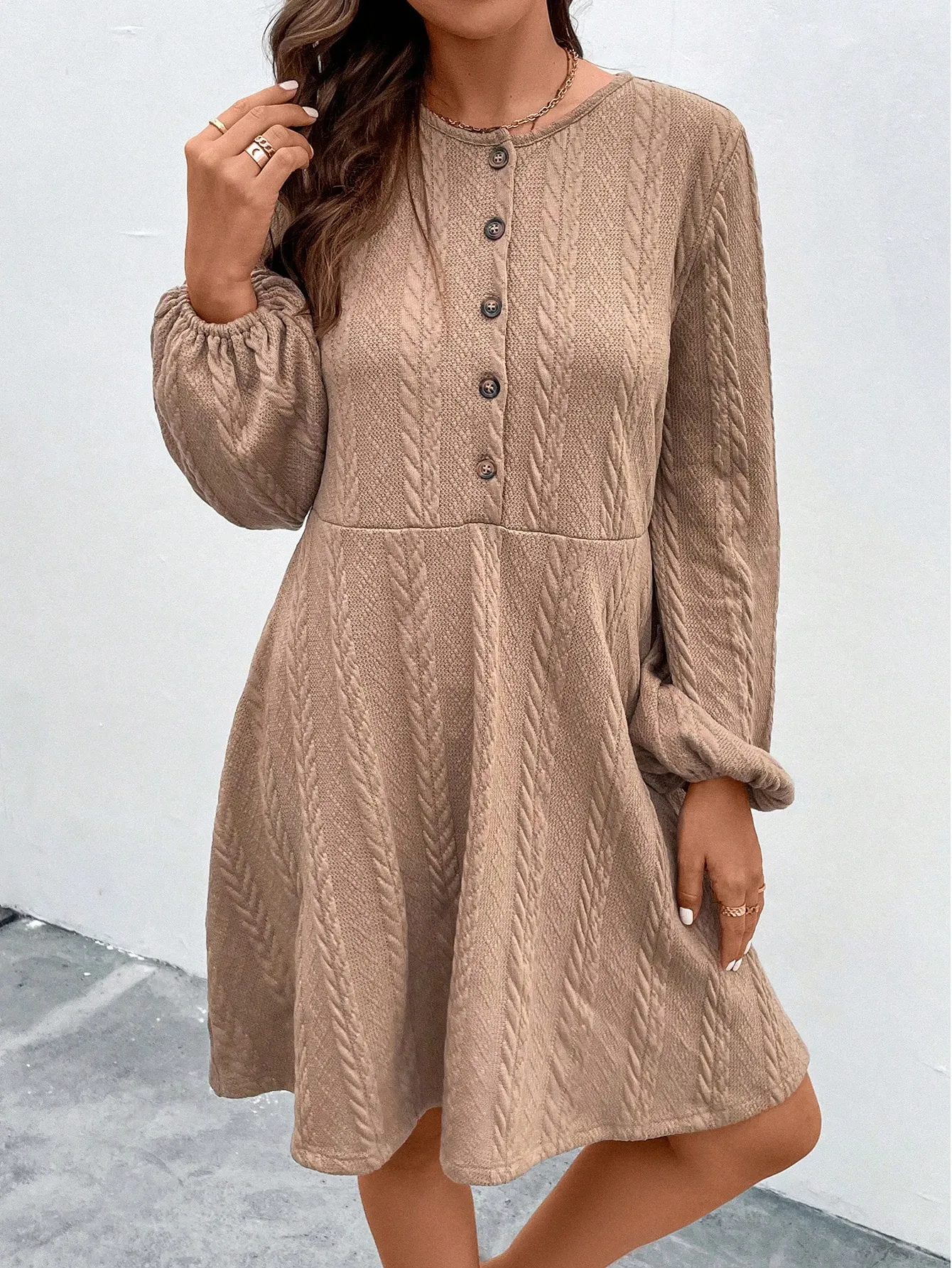 SMY Solid Button Front Lantern Sleeve Dress