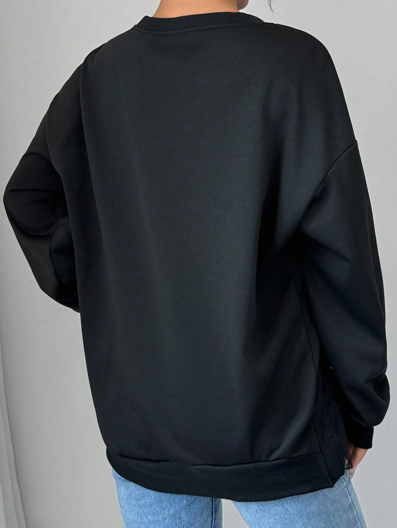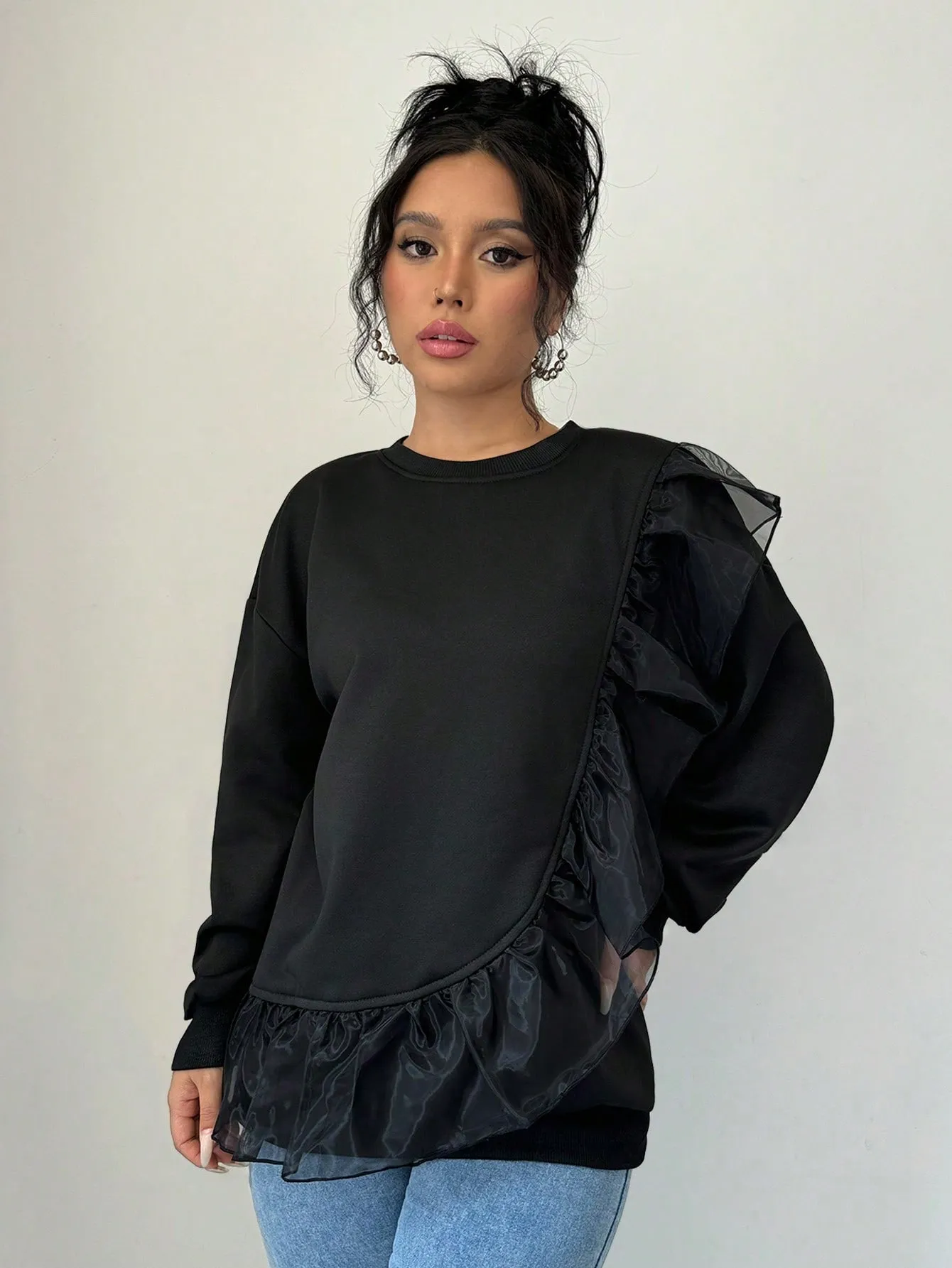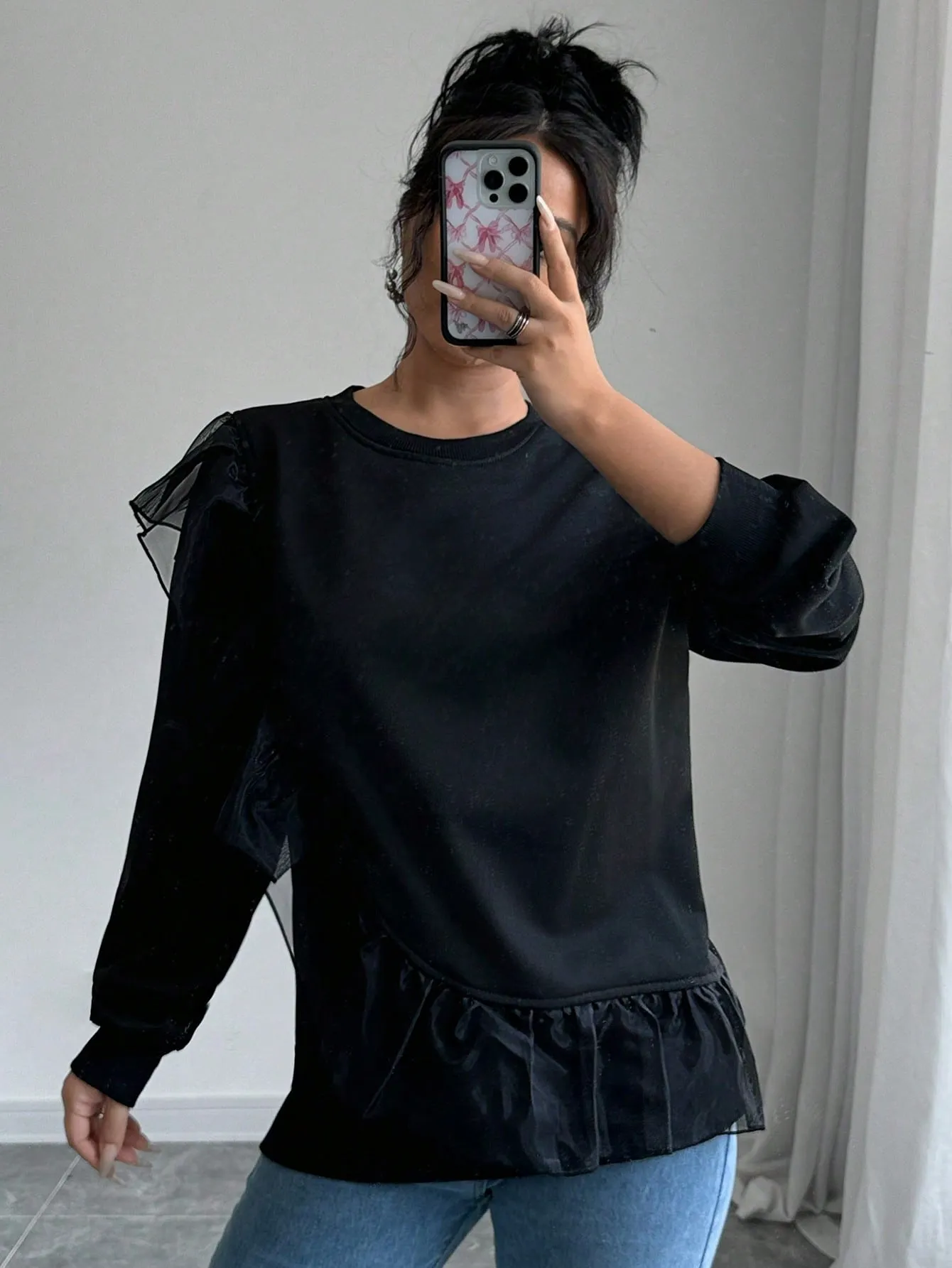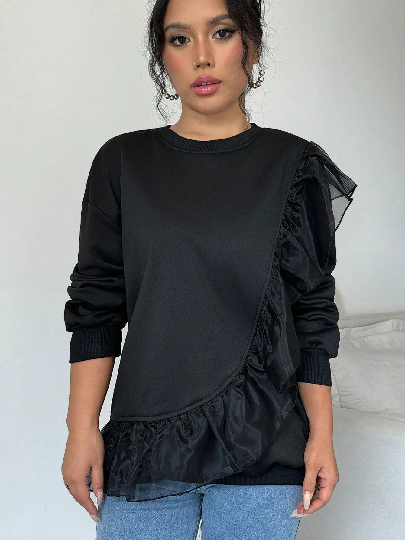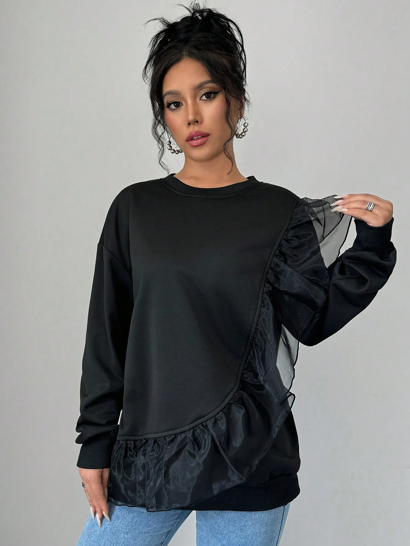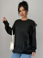 SMY Women’s Casual Stitching Mesh Ruffled Pullover Sweatshirt , Black Sweatshirt